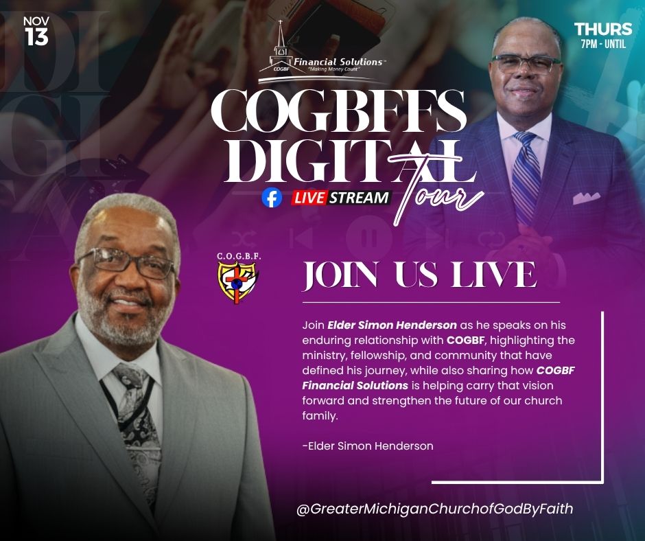 Join Elder Simon Henderson as he reflects on his powerful journey within the Church of God by Faith — a journey shaped by ministry, fellowship, and community. In this Digital Tour stop, Elder Henderson shares how COGBF Financial Solutions continues to move the vision forward by empowering churches, strengthening financial resources, and reinforcing the belief that “Making Money Count” is more than a slogan — it’s a mission.